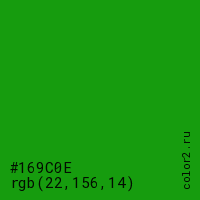 Цвет #169C0E в цветовой модели RGB обозначается тремя октетами (22, 156, 14) в десятичном формате и #169C0E в шестнадцатиричном (hex) формате, которые являются интенсивностью красного 22 (hex 16), интенсивность зелёного 156 (hex 9C) и интенсивность синего 14 (hex 0E).