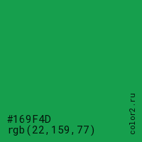 Цвет #169F4D в цветовой модели RGB обозначается тремя октетами (22, 159, 77) в десятичном формате и #169F4D в шестнадцатиричном (hex) формате, которые являются интенсивностью красного 22 (hex 16), интенсивность зелёного 159 (hex 9F) и интенсивность синего 77 (hex 4D).