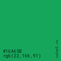 Цвет #16A65B в цветовой модели RGB обозначается тремя октетами (22, 166, 91) в десятичном формате и #16A65B в шестнадцатиричном (hex) формате, которые являются интенсивностью красного 22 (hex 16), интенсивность зелёного 166 (hex A6) и интенсивность синего 91 (hex 5B).