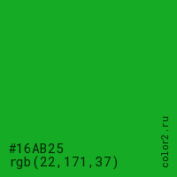 Цвет #16AB25 в цветовой модели RGB обозначается тремя октетами (22, 171, 37) в десятичном формате и #16AB25 в шестнадцатиричном (hex) формате, которые являются интенсивностью красного 22 (hex 16), интенсивность зелёного 171 (hex AB) и интенсивность синего 37 (hex 25).