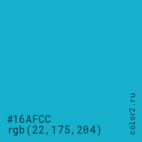 Цвет #16AFCC в цветовой модели RGB обозначается тремя октетами (22, 175, 204) в десятичном формате и #16AFCC в шестнадцатиричном (hex) формате, которые являются интенсивностью красного 22 (hex 16), интенсивность зелёного 175 (hex AF) и интенсивность синего 204 (hex CC).