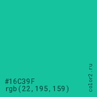 Цвет #16C39F в цветовой модели RGB обозначается тремя октетами (22, 195, 159) в десятичном формате и #16C39F в шестнадцатиричном (hex) формате, которые являются интенсивностью красного 22 (hex 16), интенсивность зелёного 195 (hex C3) и интенсивность синего 159 (hex 9F).