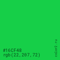 Цвет #16CF48 в цветовой модели RGB обозначается тремя октетами (22, 207, 72) в десятичном формате и #16CF48 в шестнадцатиричном (hex) формате, которые являются интенсивностью красного 22 (hex 16), интенсивность зелёного 207 (hex CF) и интенсивность синего 72 (hex 48).