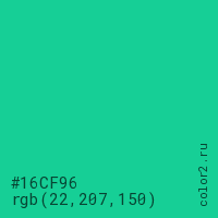 Цвет #16CF96 в цветовой модели RGB обозначается тремя октетами (22, 207, 150) в десятичном формате и #16CF96 в шестнадцатиричном (hex) формате, которые являются интенсивностью красного 22 (hex 16), интенсивность зелёного 207 (hex CF) и интенсивность синего 150 (hex 96).