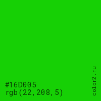 Цвет #16D005 в цветовой модели RGB обозначается тремя октетами (22, 208, 5) в десятичном формате и #16D005 в шестнадцатиричном (hex) формате, которые являются интенсивностью красного 22 (hex 16), интенсивность зелёного 208 (hex D0) и интенсивность синего 5 (hex 05).