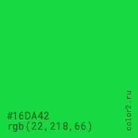 Цвет #16DA42 в цветовой модели RGB обозначается тремя октетами (22, 218, 66) в десятичном формате и #16DA42 в шестнадцатиричном (hex) формате, которые являются интенсивностью красного 22 (hex 16), интенсивность зелёного 218 (hex DA) и интенсивность синего 66 (hex 42).