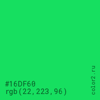 Цвет #16DF60 в цветовой модели RGB обозначается тремя октетами (22, 223, 96) в десятичном формате и #16DF60 в шестнадцатиричном (hex) формате, которые являются интенсивностью красного 22 (hex 16), интенсивность зелёного 223 (hex DF) и интенсивность синего 96 (hex 60).