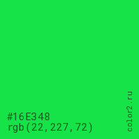 Цвет #16E348 в цветовой модели RGB обозначается тремя октетами (22, 227, 72) в десятичном формате и #16E348 в шестнадцатиричном (hex) формате, которые являются интенсивностью красного 22 (hex 16), интенсивность зелёного 227 (hex E3) и интенсивность синего 72 (hex 48).