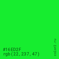 Цвет #16ED2F в цветовой модели RGB обозначается тремя октетами (22, 237, 47) в десятичном формате и #16ED2F в шестнадцатиричном (hex) формате, которые являются интенсивностью красного 22 (hex 16), интенсивность зелёного 237 (hex ED) и интенсивность синего 47 (hex 2F).