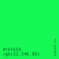 Цвет #16F655 в цветовой модели RGB обозначается тремя октетами (22, 246, 85) в десятичном формате и #16F655 в шестнадцатиричном (hex) формате, которые являются интенсивностью красного 22 (hex 16), интенсивность зелёного 246 (hex F6) и интенсивность синего 85 (hex 55).