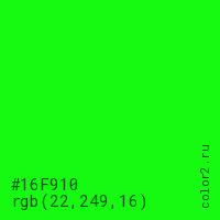 Цвет #16F910 в цветовой модели RGB обозначается тремя октетами (22, 249, 16) в десятичном формате и #16F910 в шестнадцатиричном (hex) формате, которые являются интенсивностью красного 22 (hex 16), интенсивность зелёного 249 (hex F9) и интенсивность синего 16 (hex 10).