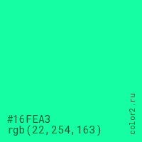 Цвет #16FEA3 в цветовой модели RGB обозначается тремя октетами (22, 254, 163) в десятичном формате и #16FEA3 в шестнадцатиричном (hex) формате, которые являются интенсивностью красного 22 (hex 16), интенсивность зелёного 254 (hex FE) и интенсивность синего 163 (hex A3).