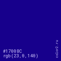 Цвет #17008C в цветовой модели RGB обозначается тремя октетами (23, 0, 140) в десятичном формате и #17008C в шестнадцатиричном (hex) формате, которые являются интенсивностью красного 23 (hex 17), интенсивность зелёного 0 (hex 00) и интенсивность синего 140 (hex 8C).