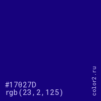 Цвет #17027D в цветовой модели RGB обозначается тремя октетами (23, 2, 125) в десятичном формате и #17027D в шестнадцатиричном (hex) формате, которые являются интенсивностью красного 23 (hex 17), интенсивность зелёного 2 (hex 02) и интенсивность синего 125 (hex 7D).
