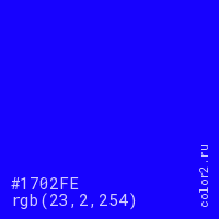 Цвет #1702FE в цветовой модели RGB обозначается тремя октетами (23, 2, 254) в десятичном формате и #1702FE в шестнадцатиричном (hex) формате, которые являются интенсивностью красного 23 (hex 17), интенсивность зелёного 2 (hex 02) и интенсивность синего 254 (hex FE).