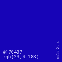 Цвет #1704B7 в цветовой модели RGB обозначается тремя октетами (23, 4, 183) в десятичном формате и #1704B7 в шестнадцатиричном (hex) формате, которые являются интенсивностью красного 23 (hex 17), интенсивность зелёного 4 (hex 04) и интенсивность синего 183 (hex B7).