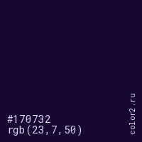 Цвет #170732 в цветовой модели RGB обозначается тремя октетами (23, 7, 50) в десятичном формате и #170732 в шестнадцатиричном (hex) формате, которые являются интенсивностью красного 23 (hex 17), интенсивность зелёного 7 (hex 07) и интенсивность синего 50 (hex 32).