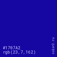 Цвет #1707A2 в цветовой модели RGB обозначается тремя октетами (23, 7, 162) в десятичном формате и #1707A2 в шестнадцатиричном (hex) формате, которые являются интенсивностью красного 23 (hex 17), интенсивность зелёного 7 (hex 07) и интенсивность синего 162 (hex A2).