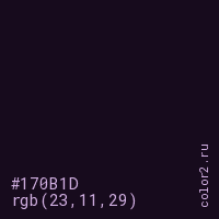 Цвет #170B1D в цветовой модели RGB обозначается тремя октетами (23, 11, 29) в десятичном формате и #170B1D в шестнадцатиричном (hex) формате, которые являются интенсивностью красного 23 (hex 17), интенсивность зелёного 11 (hex 0B) и интенсивность синего 29 (hex 1D).