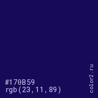 Цвет #170B59 в цветовой модели RGB обозначается тремя октетами (23, 11, 89) в десятичном формате и #170B59 в шестнадцатиричном (hex) формате, которые являются интенсивностью красного 23 (hex 17), интенсивность зелёного 11 (hex 0B) и интенсивность синего 89 (hex 59).