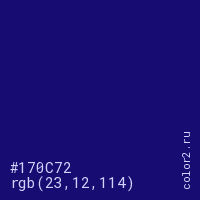 Цвет #170C72 в цветовой модели RGB обозначается тремя октетами (23, 12, 114) в десятичном формате и #170C72 в шестнадцатиричном (hex) формате, которые являются интенсивностью красного 23 (hex 17), интенсивность зелёного 12 (hex 0C) и интенсивность синего 114 (hex 72).