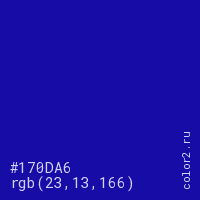 Цвет #170DA6 в цветовой модели RGB обозначается тремя октетами (23, 13, 166) в десятичном формате и #170DA6 в шестнадцатиричном (hex) формате, которые являются интенсивностью красного 23 (hex 17), интенсивность зелёного 13 (hex 0D) и интенсивность синего 166 (hex A6).