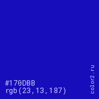 Цвет #170DBB в цветовой модели RGB обозначается тремя октетами (23, 13, 187) в десятичном формате и #170DBB в шестнадцатиричном (hex) формате, которые являются интенсивностью красного 23 (hex 17), интенсивность зелёного 13 (hex 0D) и интенсивность синего 187 (hex BB).