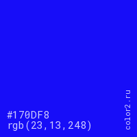 Цвет #170DF8 в цветовой модели RGB обозначается тремя октетами (23, 13, 248) в десятичном формате и #170DF8 в шестнадцатиричном (hex) формате, которые являются интенсивностью красного 23 (hex 17), интенсивность зелёного 13 (hex 0D) и интенсивность синего 248 (hex F8).
