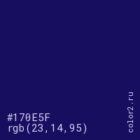 Цвет #170E5F в цветовой модели RGB обозначается тремя октетами (23, 14, 95) в десятичном формате и #170E5F в шестнадцатиричном (hex) формате, которые являются интенсивностью красного 23 (hex 17), интенсивность зелёного 14 (hex 0E) и интенсивность синего 95 (hex 5F).
