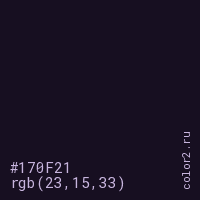 Цвет #170F21 в цветовой модели RGB обозначается тремя октетами (23, 15, 33) в десятичном формате и #170F21 в шестнадцатиричном (hex) формате, которые являются интенсивностью красного 23 (hex 17), интенсивность зелёного 15 (hex 0F) и интенсивность синего 33 (hex 21).