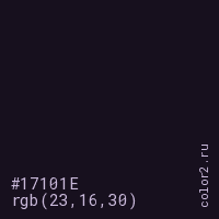 Цвет #17101E в цветовой модели RGB обозначается тремя октетами (23, 16, 30) в десятичном формате и #17101E в шестнадцатиричном (hex) формате, которые являются интенсивностью красного 23 (hex 17), интенсивность зелёного 16 (hex 10) и интенсивность синего 30 (hex 1E).