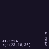 Цвет #171224 в цветовой модели RGB обозначается тремя октетами (23, 18, 36) в десятичном формате и #171224 в шестнадцатиричном (hex) формате, которые являются интенсивностью красного 23 (hex 17), интенсивность зелёного 18 (hex 12) и интенсивность синего 36 (hex 24).