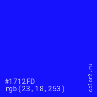 Цвет #1712FD в цветовой модели RGB обозначается тремя октетами (23, 18, 253) в десятичном формате и #1712FD в шестнадцатиричном (hex) формате, которые являются интенсивностью красного 23 (hex 17), интенсивность зелёного 18 (hex 12) и интенсивность синего 253 (hex FD).