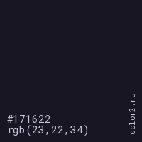 Цвет #171622 в цветовой модели RGB обозначается тремя октетами (23, 22, 34) в десятичном формате и #171622 в шестнадцатиричном (hex) формате, которые являются интенсивностью красного 23 (hex 17), интенсивность зелёного 22 (hex 16) и интенсивность синего 34 (hex 22).