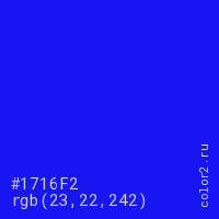 Цвет #1716F2 в цветовой модели RGB обозначается тремя октетами (23, 22, 242) в десятичном формате и #1716F2 в шестнадцатиричном (hex) формате, которые являются интенсивностью красного 23 (hex 17), интенсивность зелёного 22 (hex 16) и интенсивность синего 242 (hex F2).