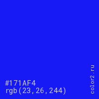 Цвет #171AF4 в цветовой модели RGB обозначается тремя октетами (23, 26, 244) в десятичном формате и #171AF4 в шестнадцатиричном (hex) формате, которые являются интенсивностью красного 23 (hex 17), интенсивность зелёного 26 (hex 1A) и интенсивность синего 244 (hex F4).