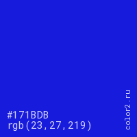Цвет #171BDB в цветовой модели RGB обозначается тремя октетами (23, 27, 219) в десятичном формате и #171BDB в шестнадцатиричном (hex) формате, которые являются интенсивностью красного 23 (hex 17), интенсивность зелёного 27 (hex 1B) и интенсивность синего 219 (hex DB).