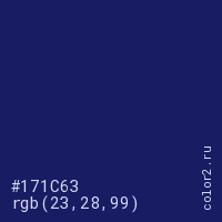 Цвет #171C63 в цветовой модели RGB обозначается тремя октетами (23, 28, 99) в десятичном формате и #171C63 в шестнадцатиричном (hex) формате, которые являются интенсивностью красного 23 (hex 17), интенсивность зелёного 28 (hex 1C) и интенсивность синего 99 (hex 63).