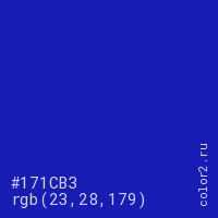 Цвет #171CB3 в цветовой модели RGB обозначается тремя октетами (23, 28, 179) в десятичном формате и #171CB3 в шестнадцатиричном (hex) формате, которые являются интенсивностью красного 23 (hex 17), интенсивность зелёного 28 (hex 1C) и интенсивность синего 179 (hex B3).