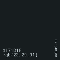 Цвет #171D1F в цветовой модели RGB обозначается тремя октетами (23, 29, 31) в десятичном формате и #171D1F в шестнадцатиричном (hex) формате, которые являются интенсивностью красного 23 (hex 17), интенсивность зелёного 29 (hex 1D) и интенсивность синего 31 (hex 1F).