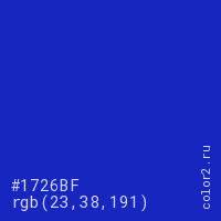 Цвет #1726BF в цветовой модели RGB обозначается тремя октетами (23, 38, 191) в десятичном формате и #1726BF в шестнадцатиричном (hex) формате, которые являются интенсивностью красного 23 (hex 17), интенсивность зелёного 38 (hex 26) и интенсивность синего 191 (hex BF).