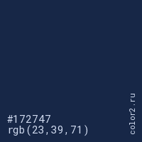 Цвет #172747 в цветовой модели RGB обозначается тремя октетами (23, 39, 71) в десятичном формате и #172747 в шестнадцатиричном (hex) формате, которые являются интенсивностью красного 23 (hex 17), интенсивность зелёного 39 (hex 27) и интенсивность синего 71 (hex 47).