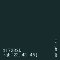 Цвет #172B2D в цветовой модели RGB обозначается тремя октетами (23, 43, 45) в десятичном формате и #172B2D в шестнадцатиричном (hex) формате, которые являются интенсивностью красного 23 (hex 17), интенсивность зелёного 43 (hex 2B) и интенсивность синего 45 (hex 2D).