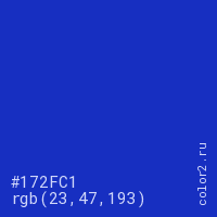 Цвет #172FC1 в цветовой модели RGB обозначается тремя октетами (23, 47, 193) в десятичном формате и #172FC1 в шестнадцатиричном (hex) формате, которые являются интенсивностью красного 23 (hex 17), интенсивность зелёного 47 (hex 2F) и интенсивность синего 193 (hex C1).