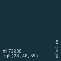 Цвет #17303B в цветовой модели RGB обозначается тремя октетами (23, 48, 59) в десятичном формате и #17303B в шестнадцатиричном (hex) формате, которые являются интенсивностью красного 23 (hex 17), интенсивность зелёного 48 (hex 30) и интенсивность синего 59 (hex 3B).