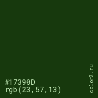 Цвет #17390D в цветовой модели RGB обозначается тремя октетами (23, 57, 13) в десятичном формате и #17390D в шестнадцатиричном (hex) формате, которые являются интенсивностью красного 23 (hex 17), интенсивность зелёного 57 (hex 39) и интенсивность синего 13 (hex 0D).