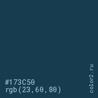 Цвет #173C50 в цветовой модели RGB обозначается тремя октетами (23, 60, 80) в десятичном формате и #173C50 в шестнадцатиричном (hex) формате, которые являются интенсивностью красного 23 (hex 17), интенсивность зелёного 60 (hex 3C) и интенсивность синего 80 (hex 50).