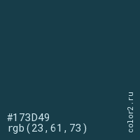 Цвет #173D49 в цветовой модели RGB обозначается тремя октетами (23, 61, 73) в десятичном формате и #173D49 в шестнадцатиричном (hex) формате, которые являются интенсивностью красного 23 (hex 17), интенсивность зелёного 61 (hex 3D) и интенсивность синего 73 (hex 49).