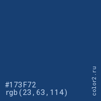 Цвет #173F72 в цветовой модели RGB обозначается тремя октетами (23, 63, 114) в десятичном формате и #173F72 в шестнадцатиричном (hex) формате, которые являются интенсивностью красного 23 (hex 17), интенсивность зелёного 63 (hex 3F) и интенсивность синего 114 (hex 72).