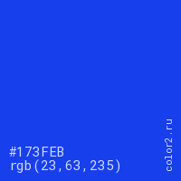 Цвет #173FEB в цветовой модели RGB обозначается тремя октетами (23, 63, 235) в десятичном формате и #173FEB в шестнадцатиричном (hex) формате, которые являются интенсивностью красного 23 (hex 17), интенсивность зелёного 63 (hex 3F) и интенсивность синего 235 (hex EB).